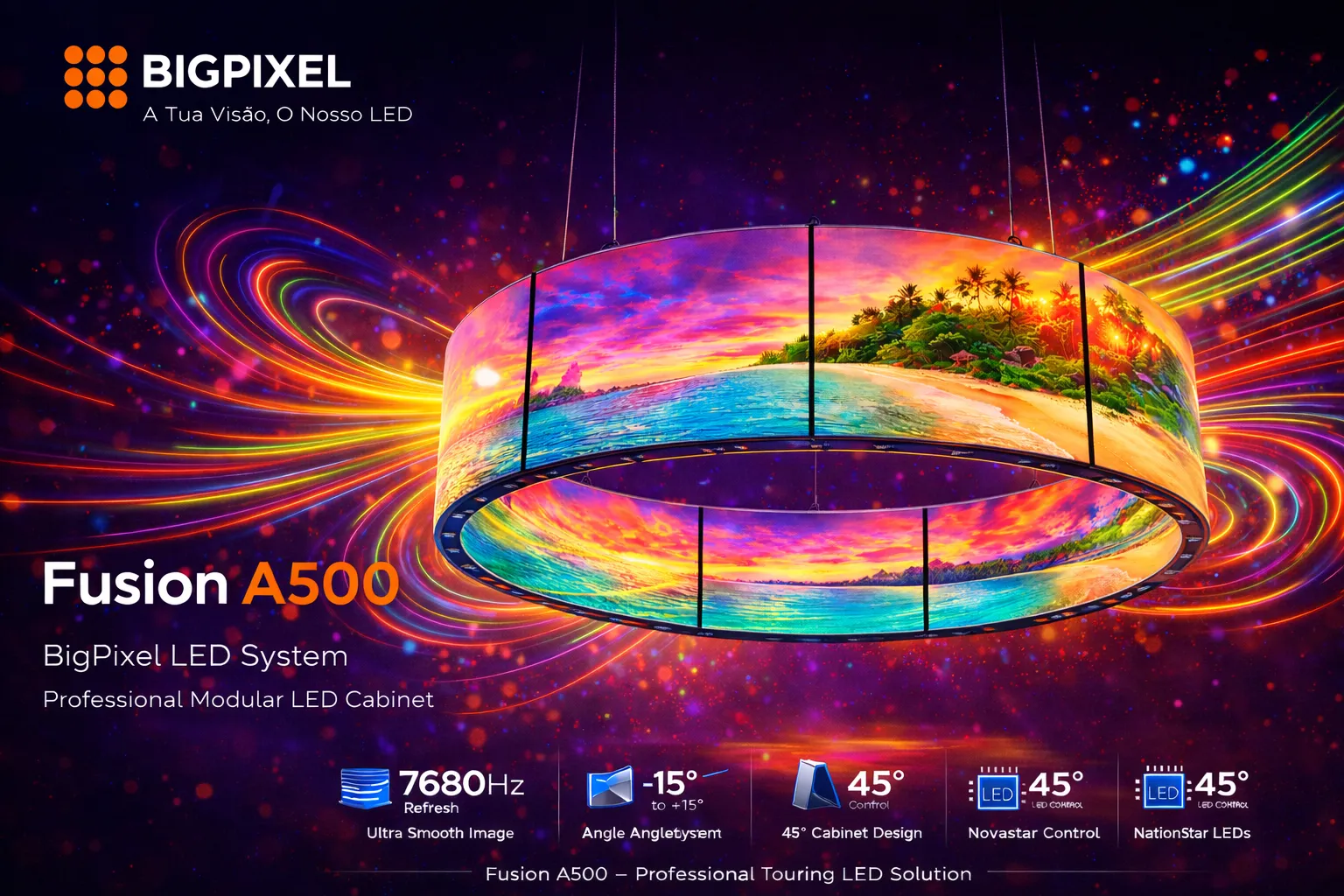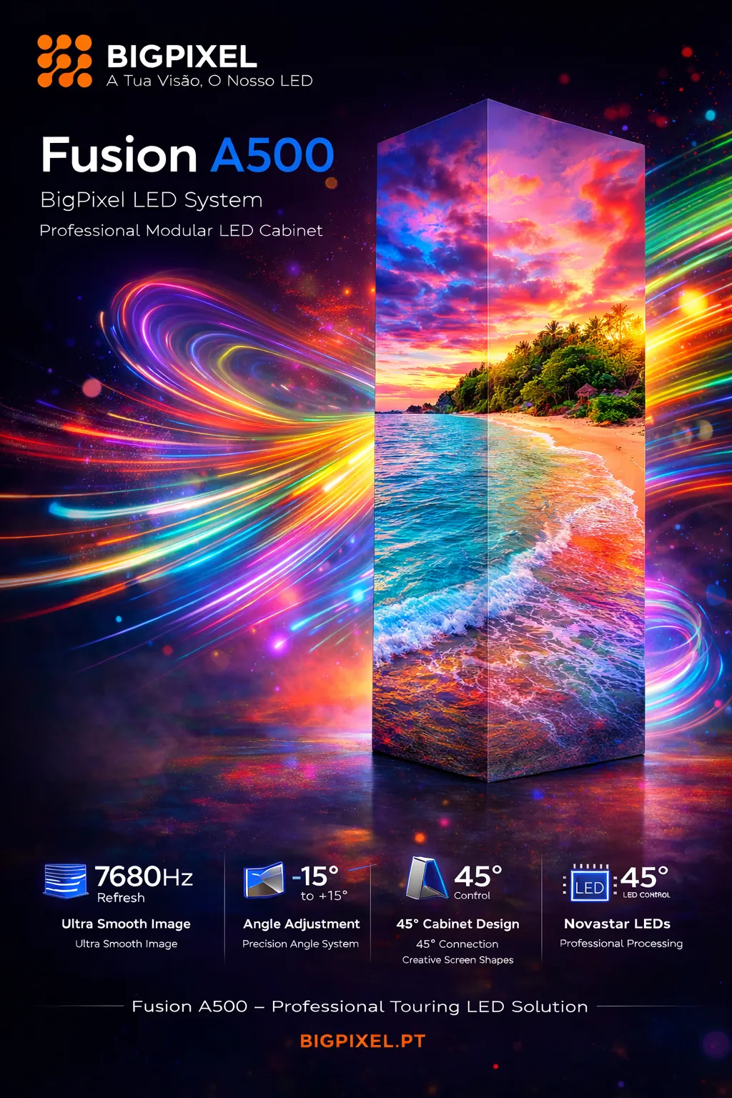Perfeito para publicidade, espetáculos, eventos desportivos e qualquer aplicação que precise de impacto visual sem perder a praticidade.
